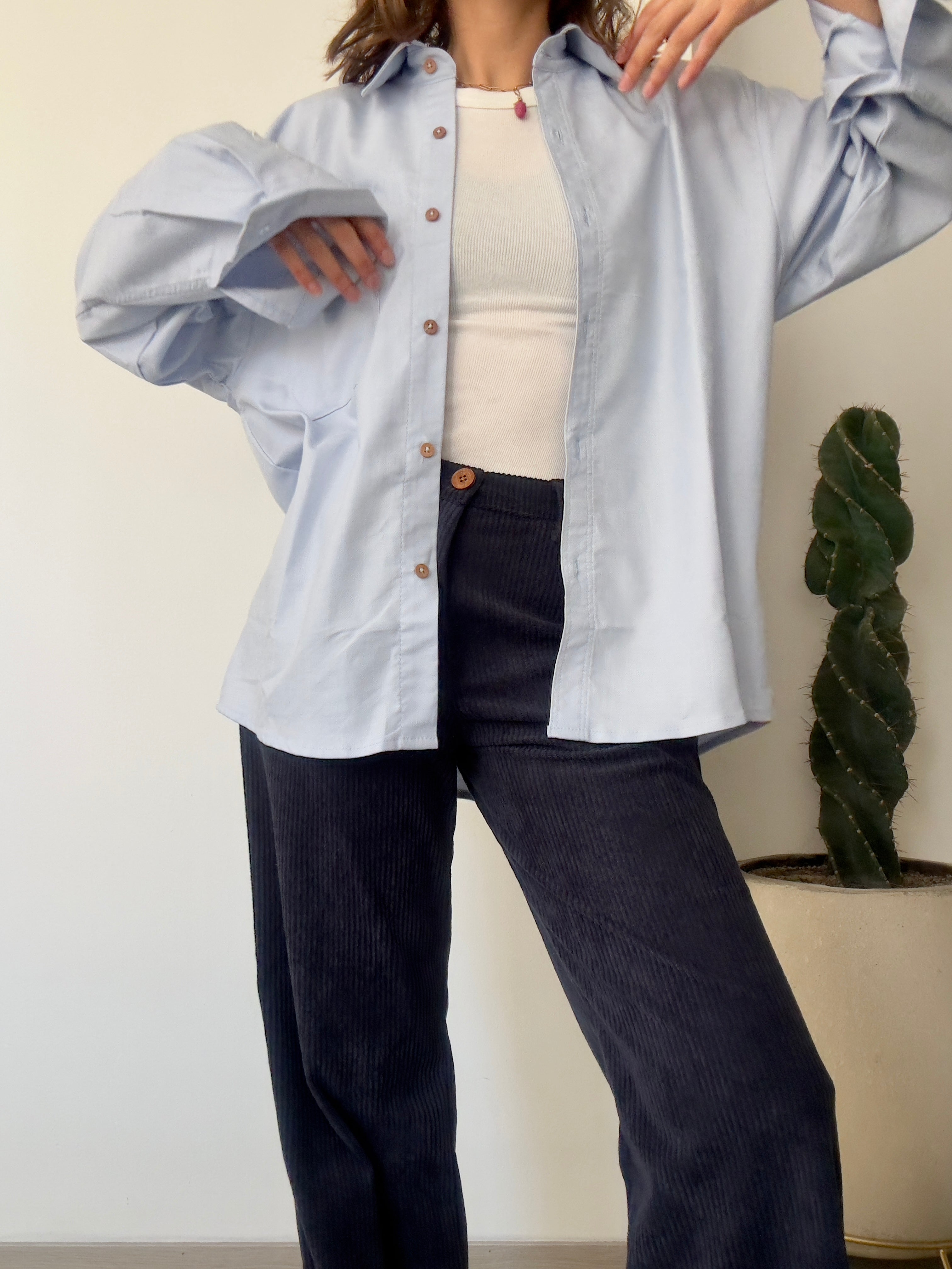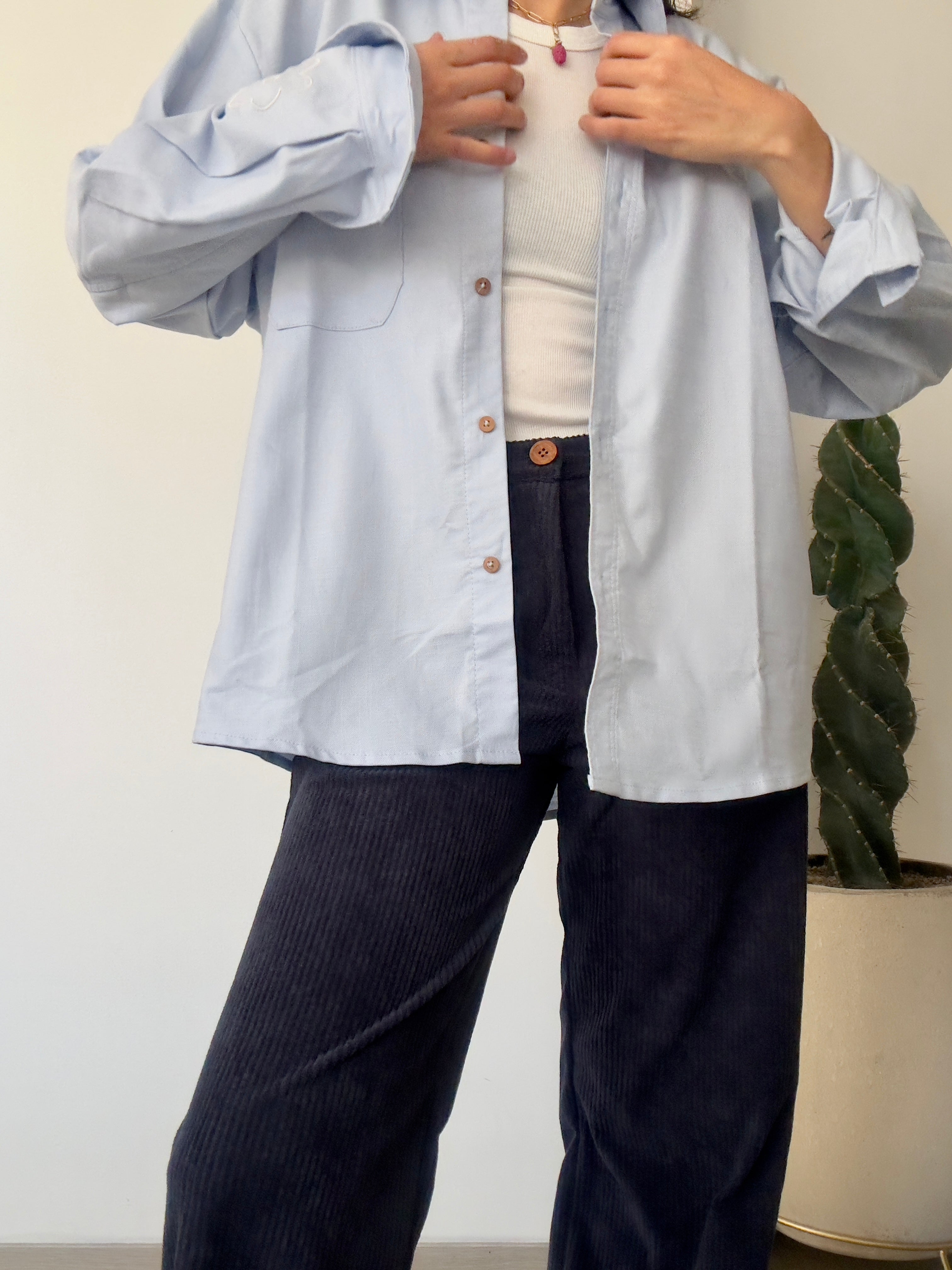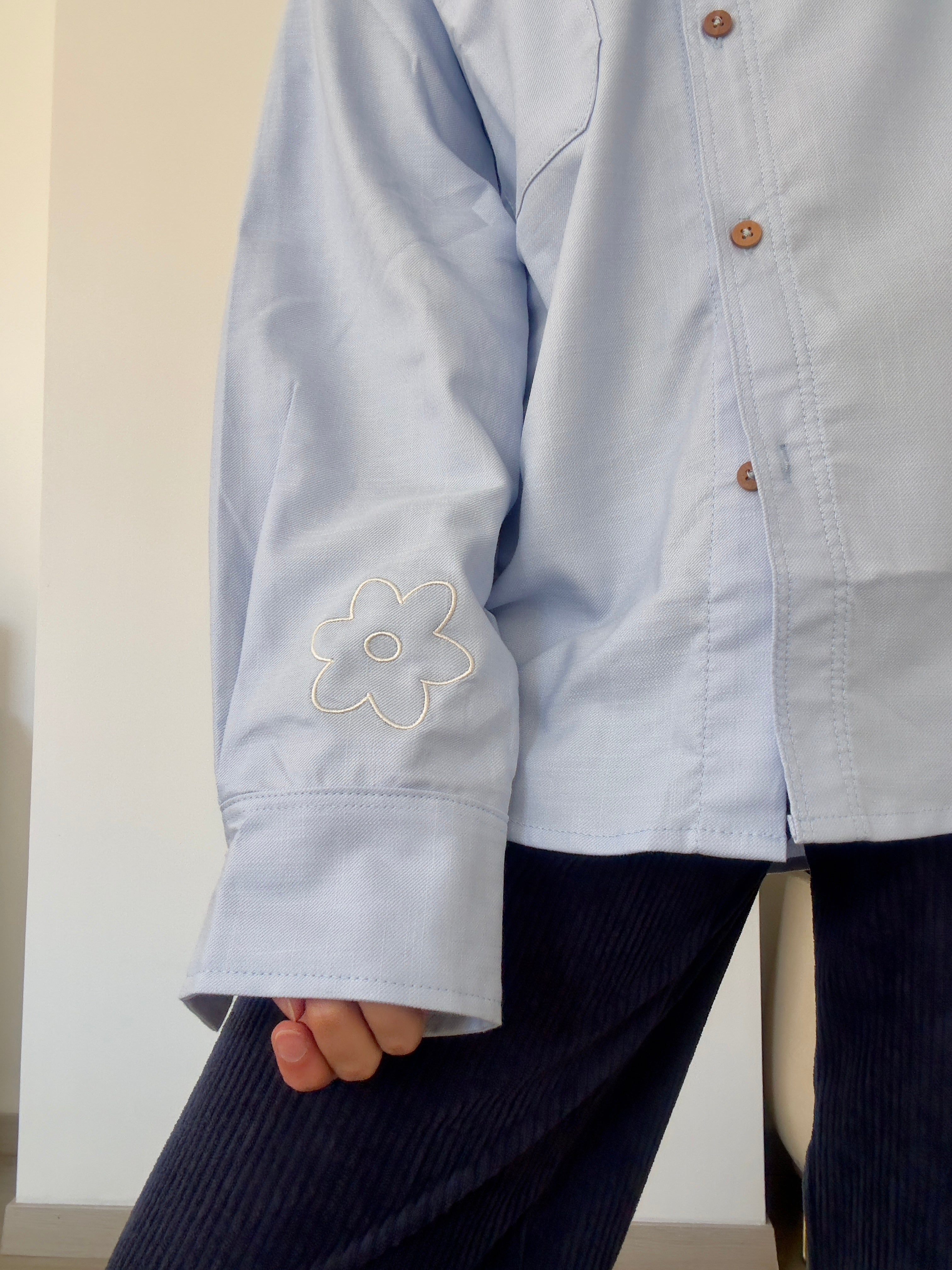 Camisa en algodón textura muy suave, con botones en madera. Tiene una flor bordada en la manga.