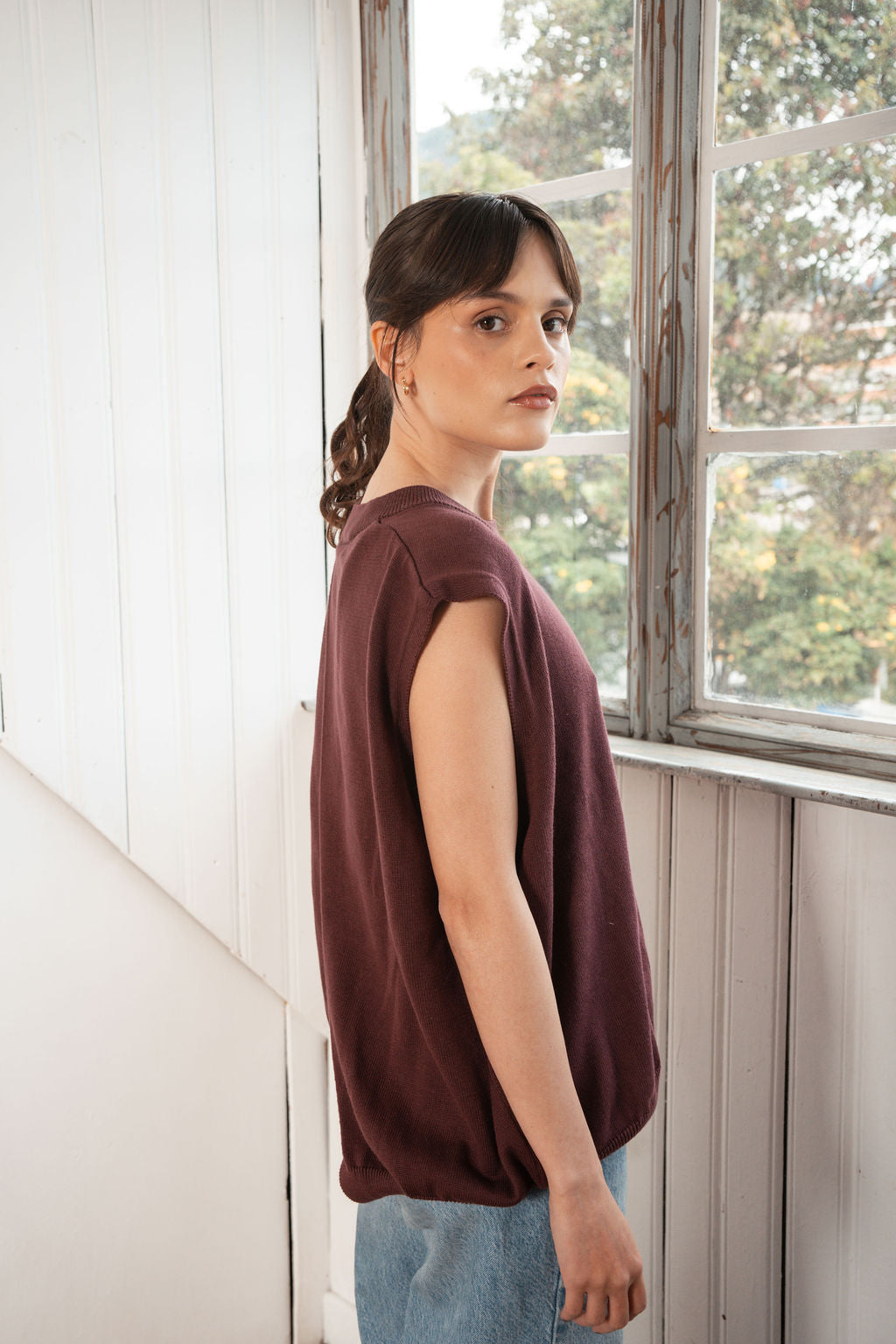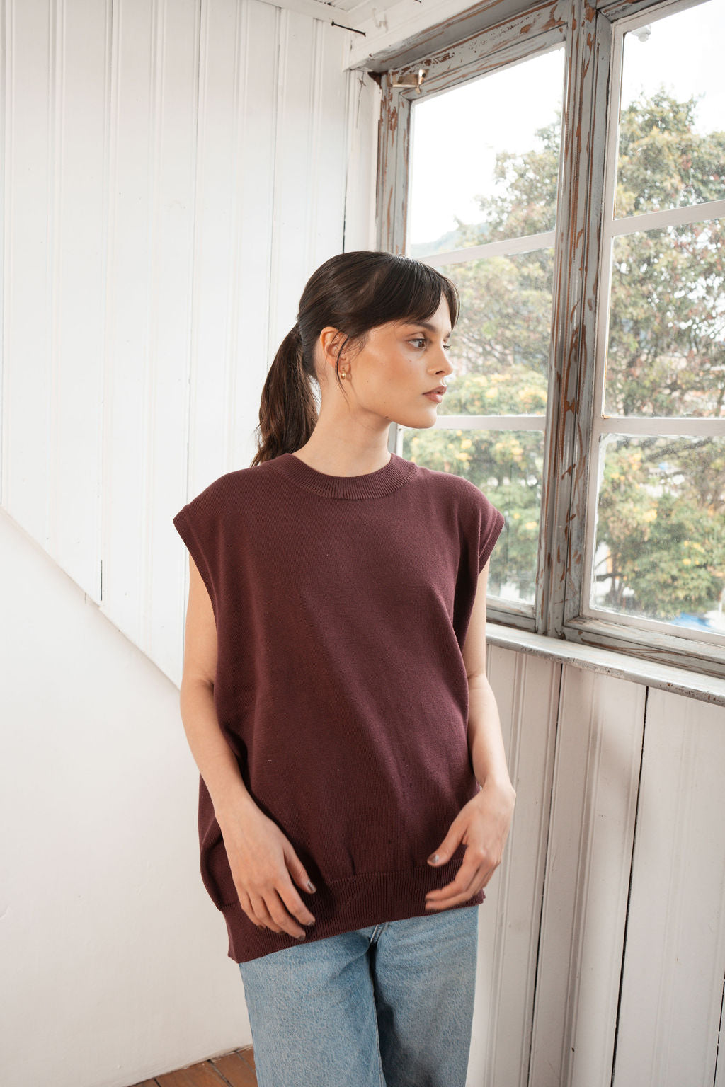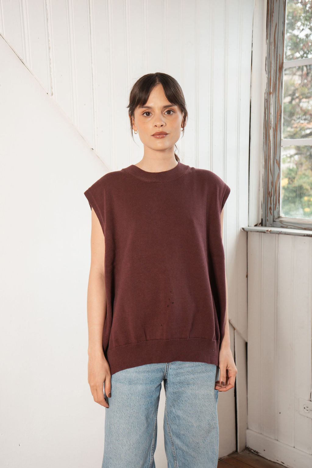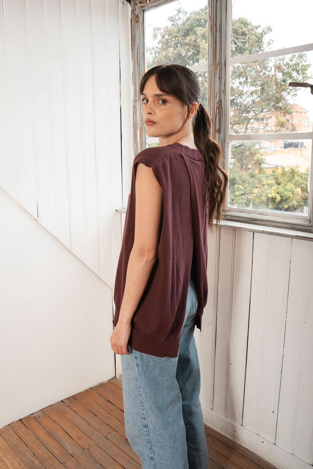 Chaleco tejido en algodón suaveee, con abertura cruzada en la espalda. Silueta sueltica y oversized, muy easy y cool.