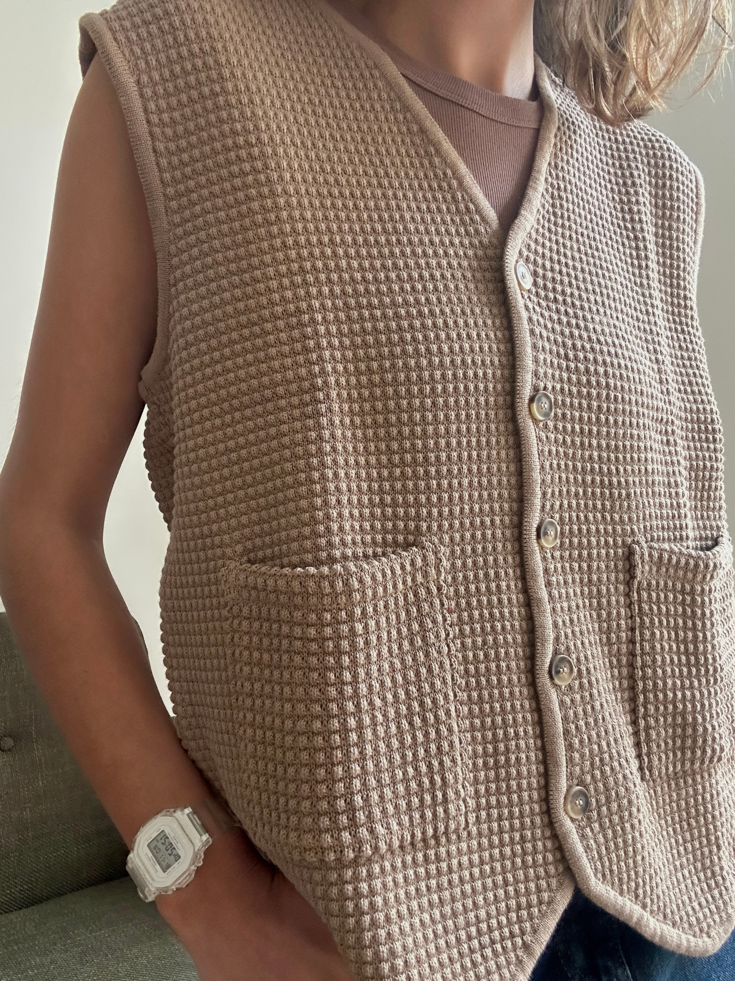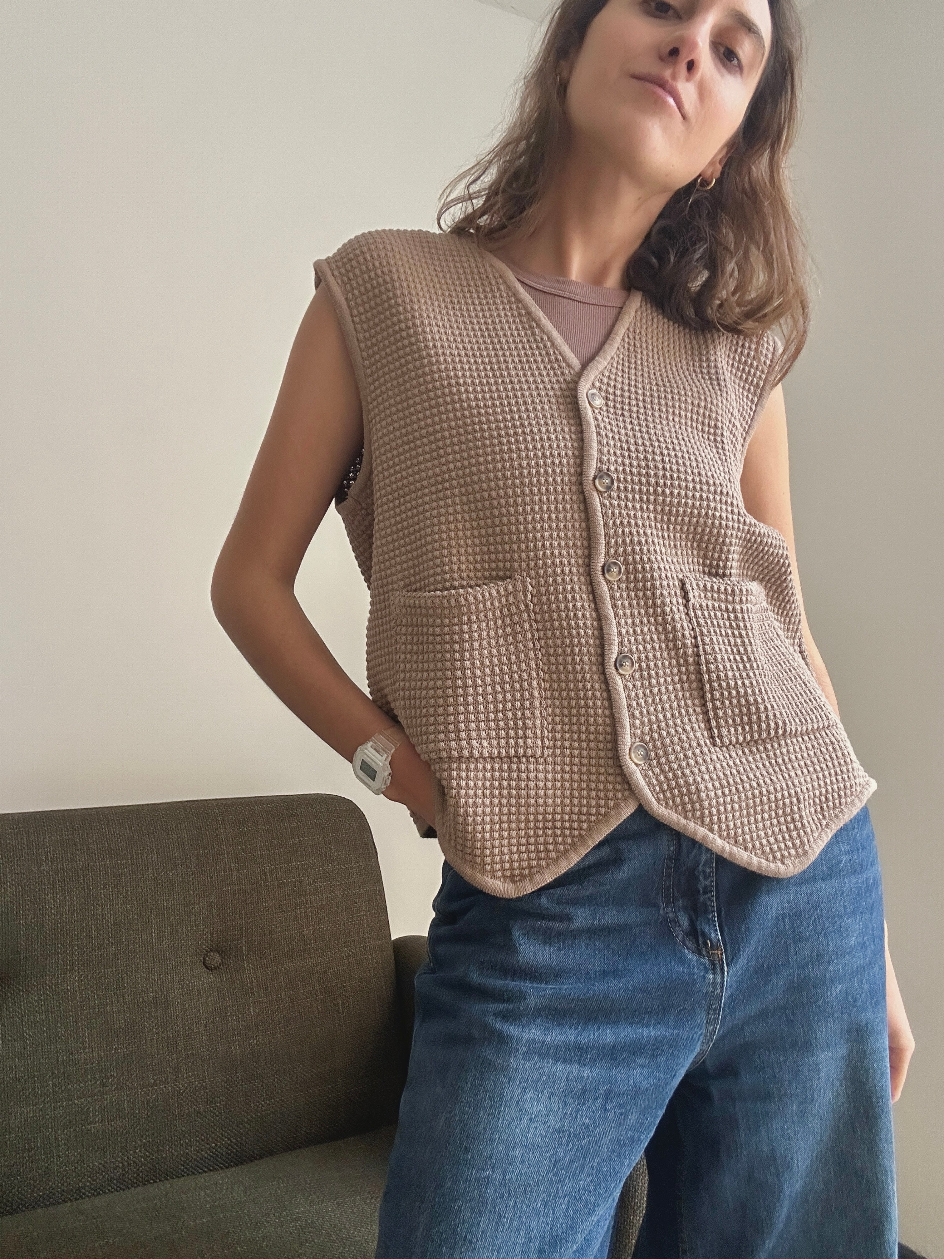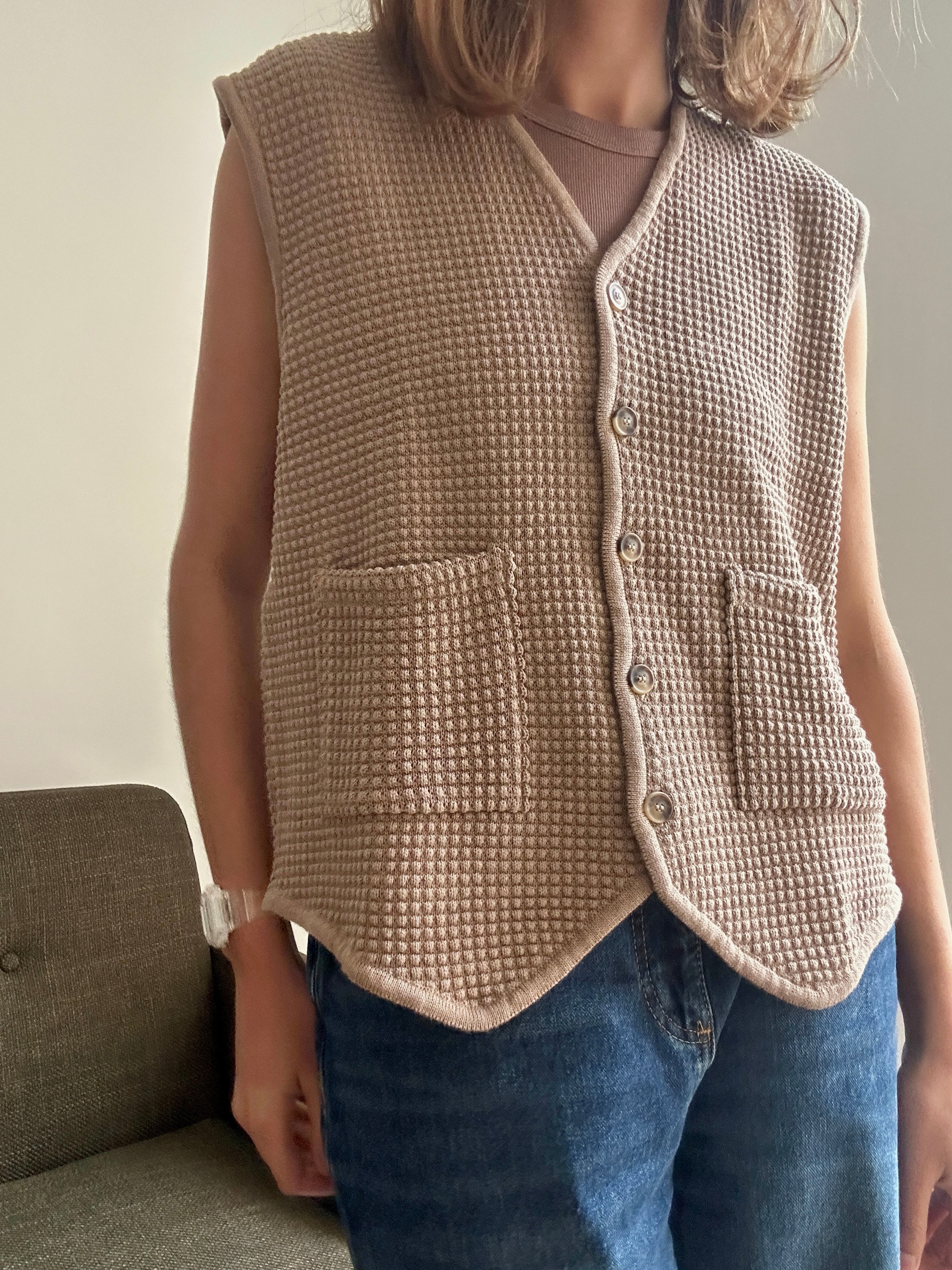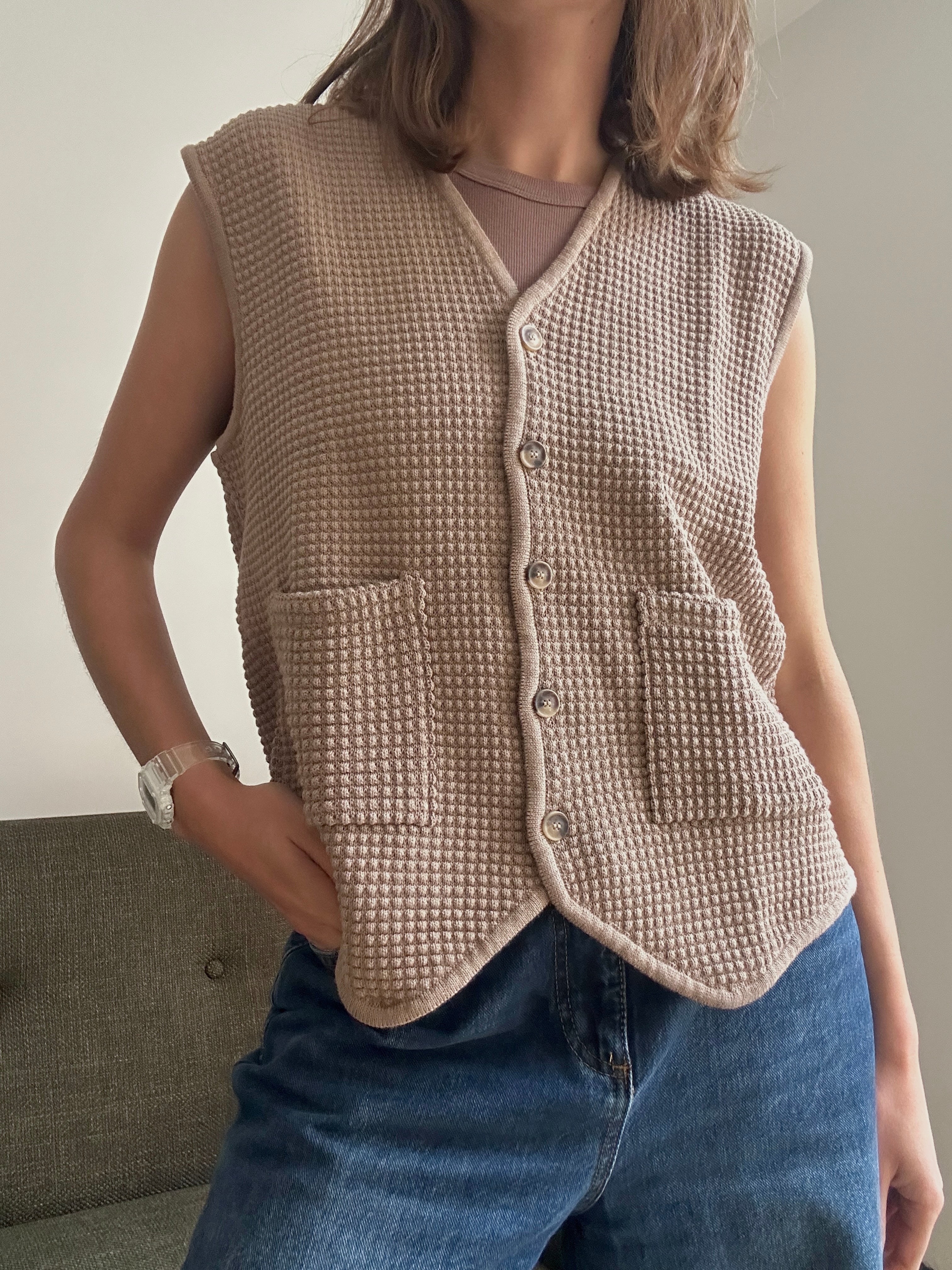 Chaleco tejido en algodón textura tipo waffle. Botones cafés y bolsillos tipo parche.