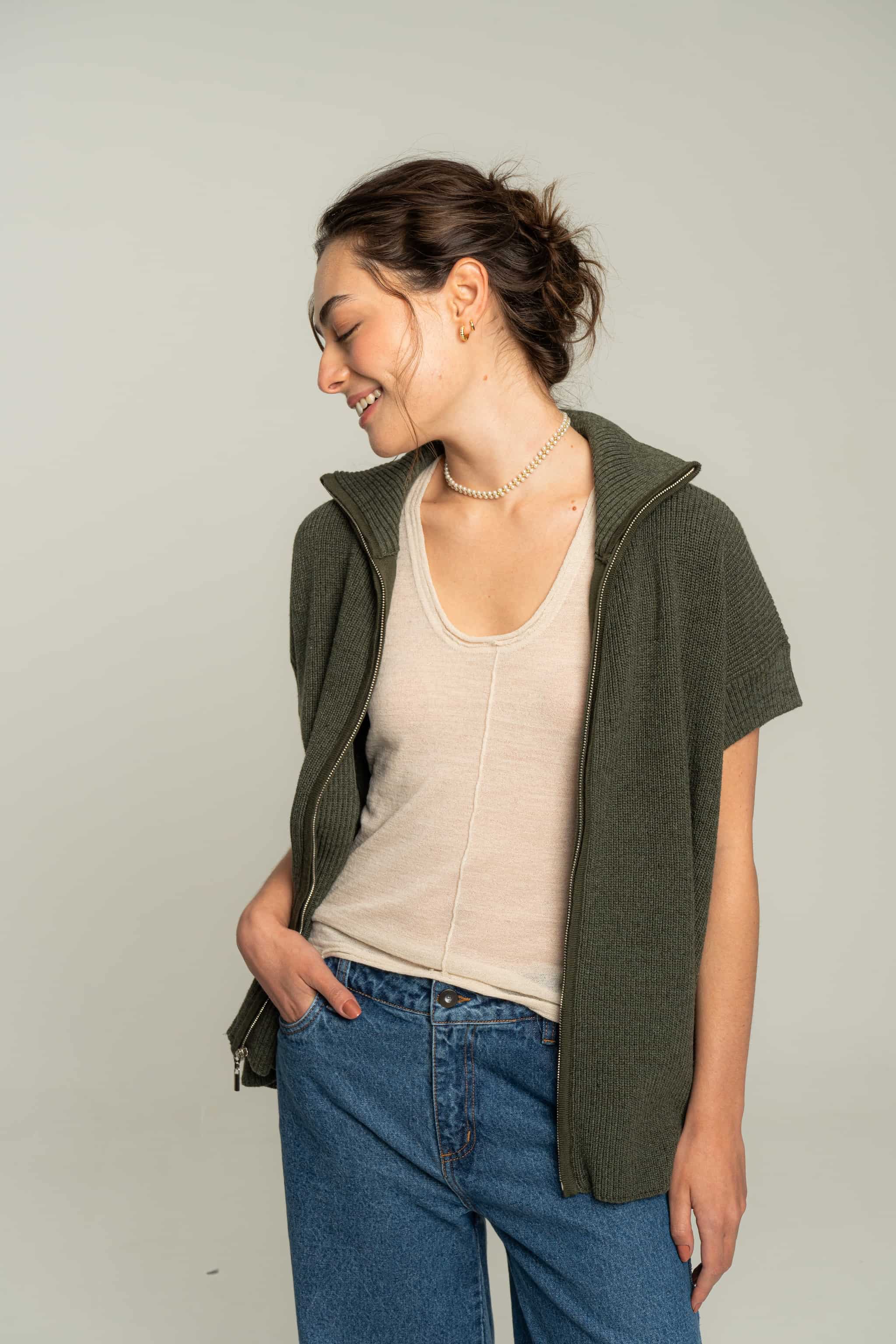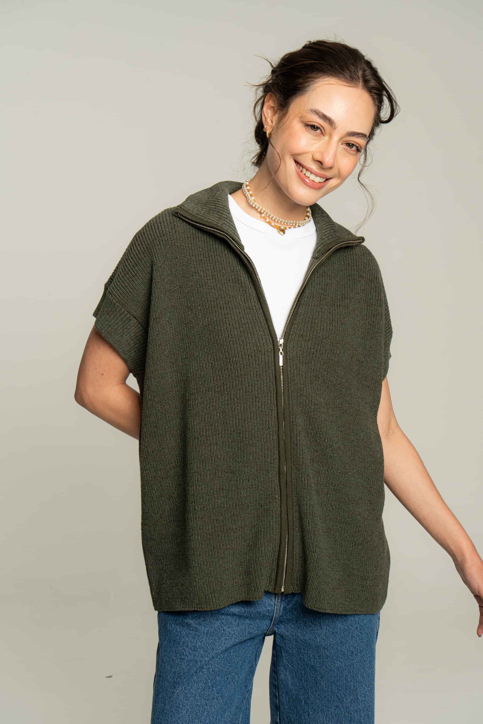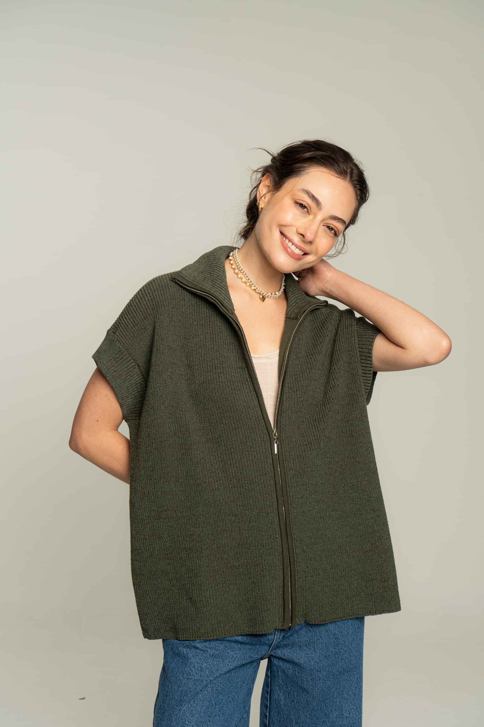 Chaleco tejido en algodón con cremallera. Silueta overzised y textura suave. Una prenda muy versátil para usar como un top en días de calor o con una capa debajo para días más fríos.
