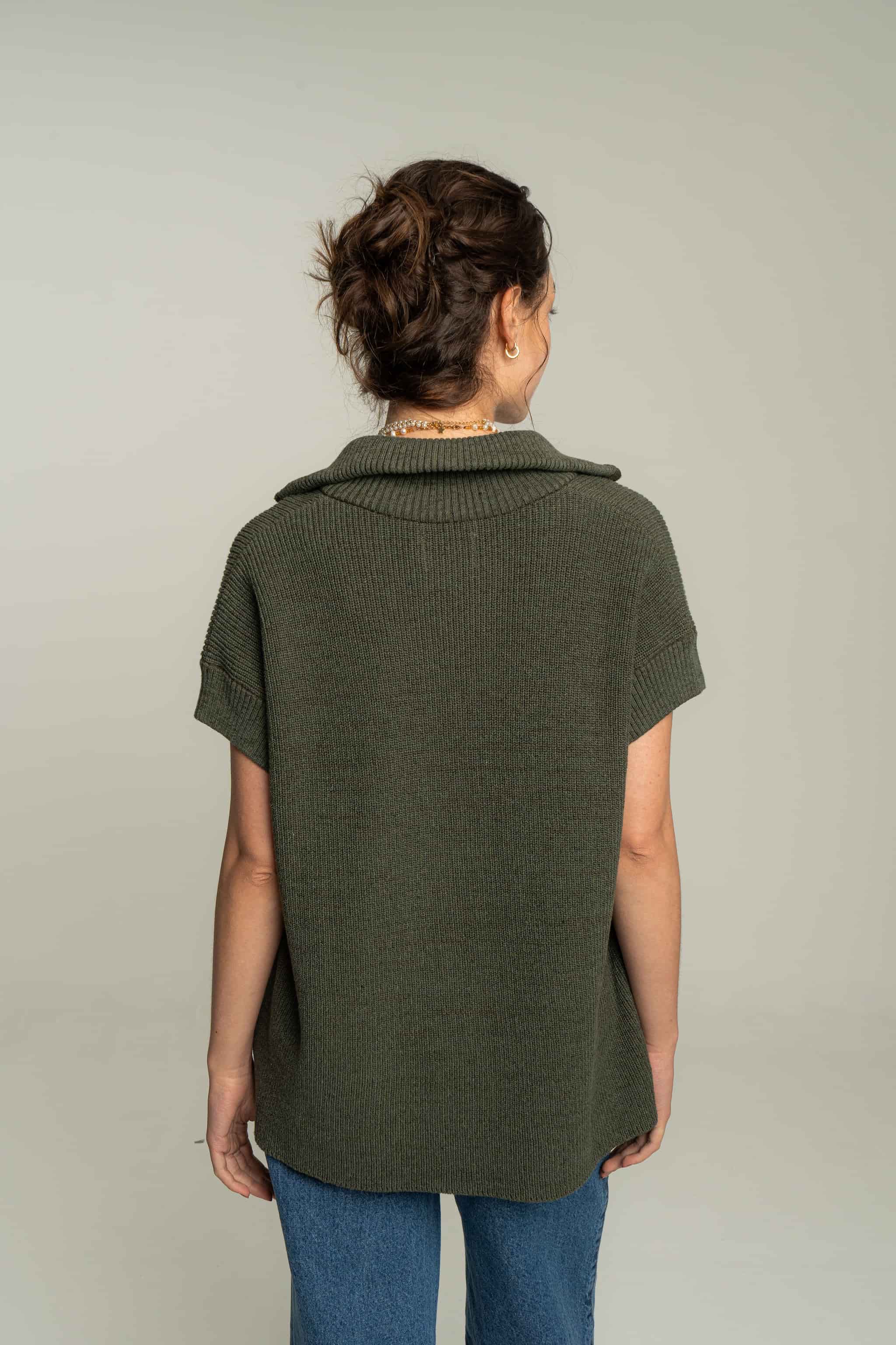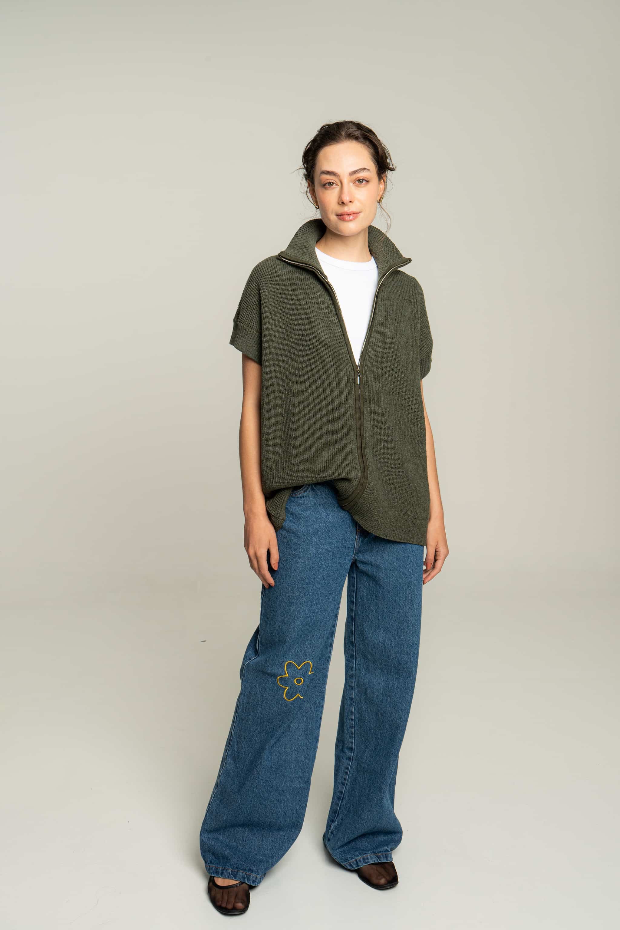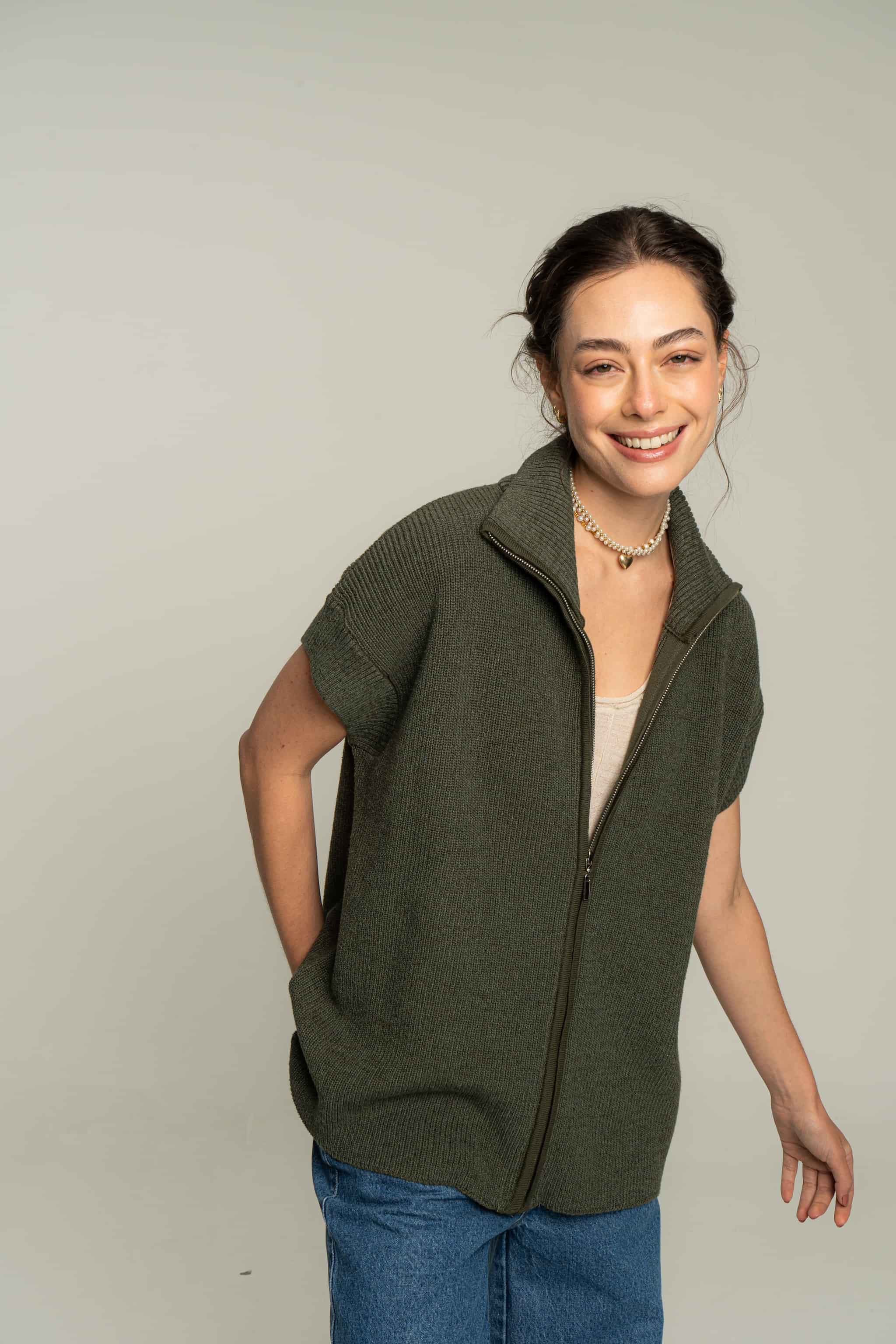 Chaleco tejido en algodón con cremallera. Silueta overzised y textura suave. Una prenda muy versátil para usar como un top en días de calor o con una capa debajo para días más fríos.