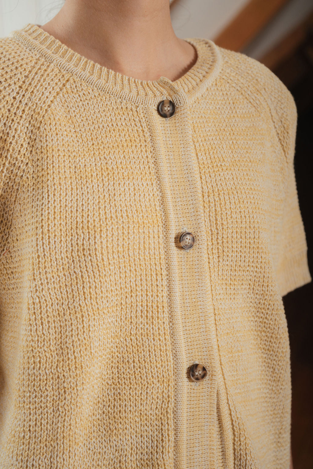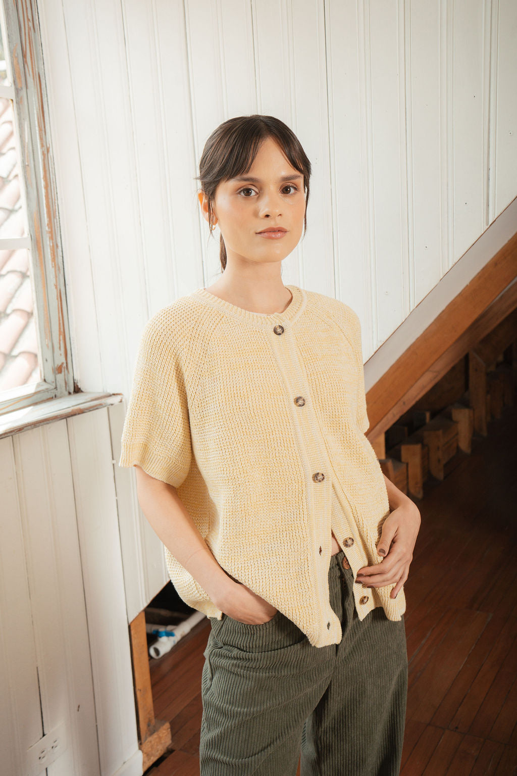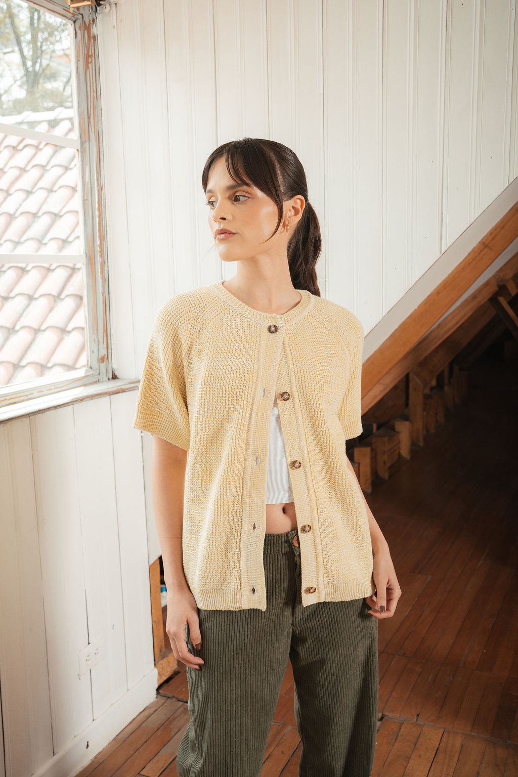 Sweater tipo cárdigan manga corta, tejido perlado. Diseño especial para usar con los botones adelante o en la espalda.