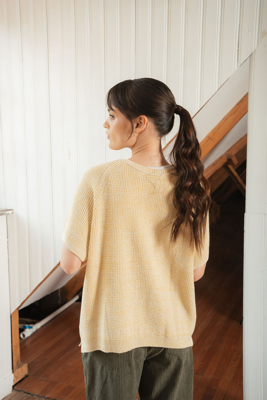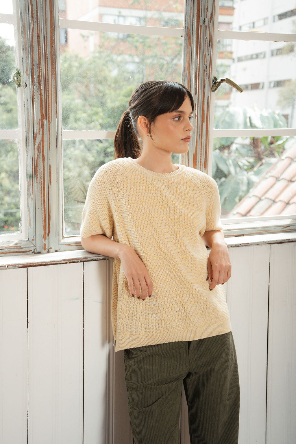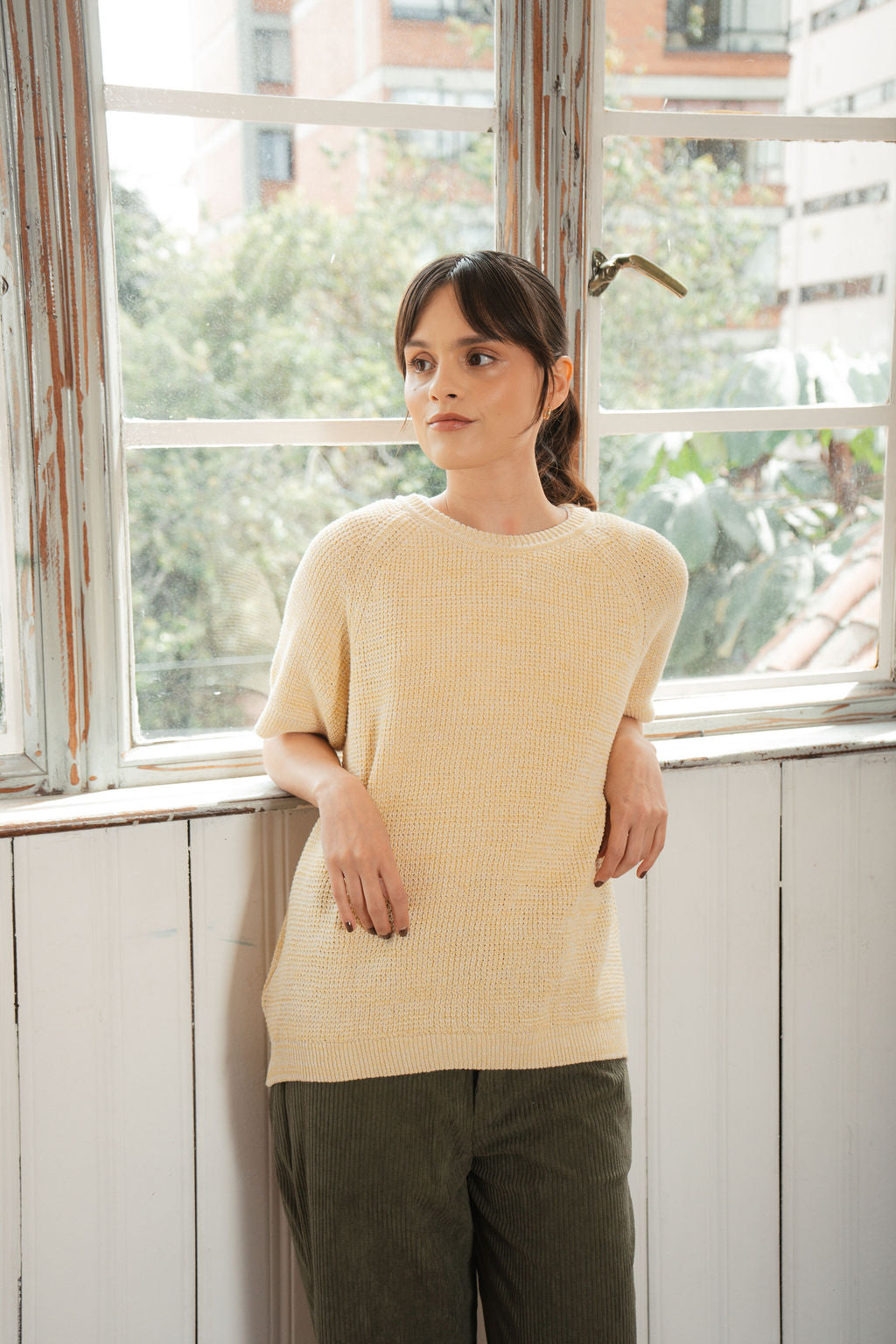 Sweater tipo cárdigan manga corta, tejido perlado. Diseño especial para usar con los botones adelante o en la espalda.