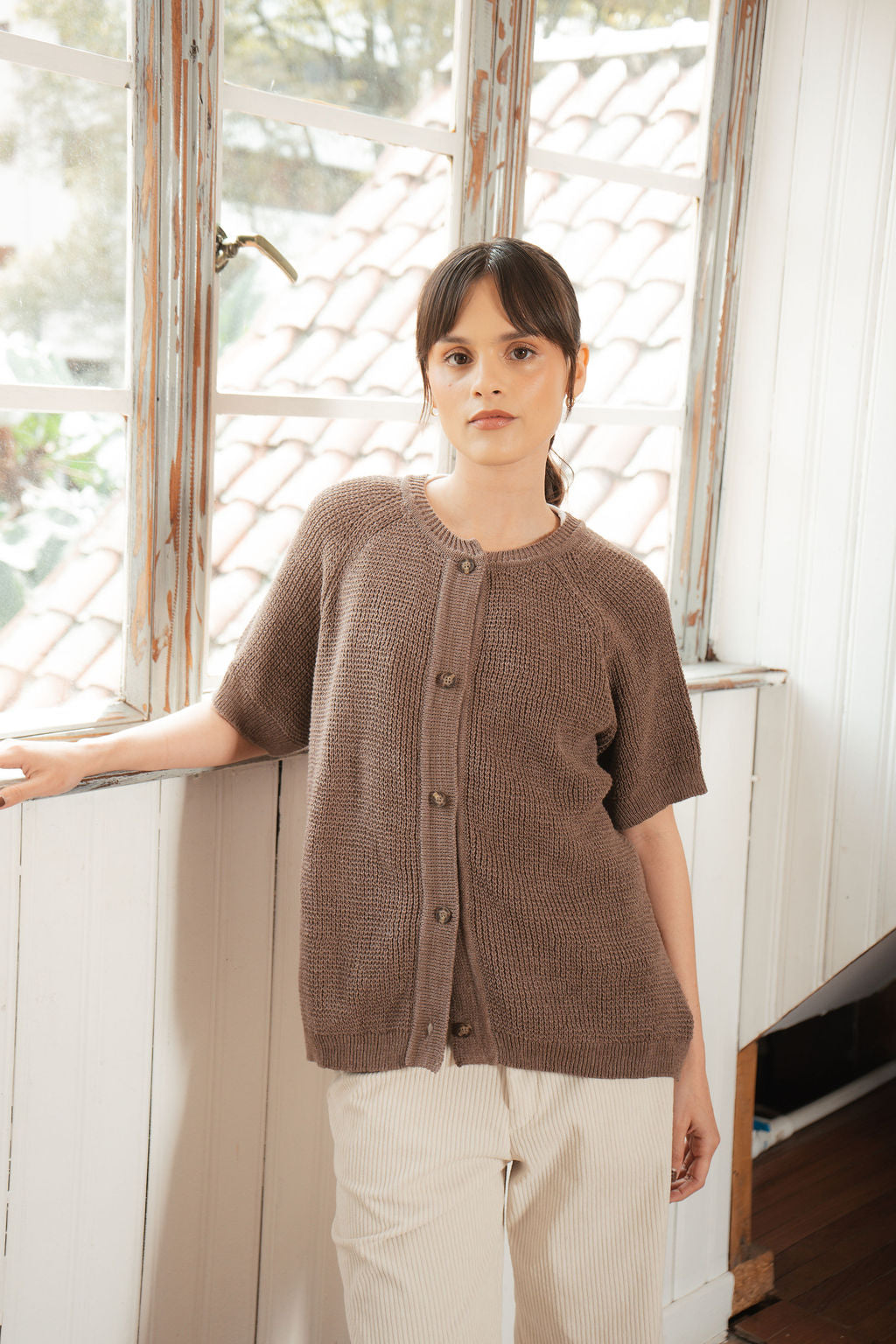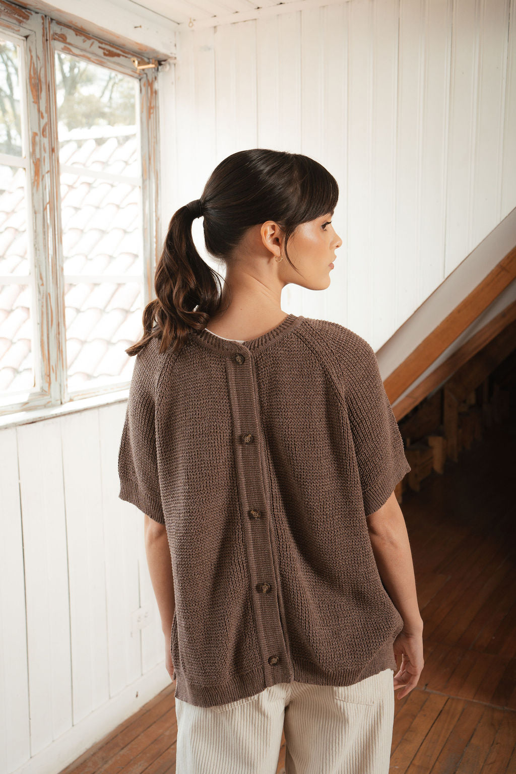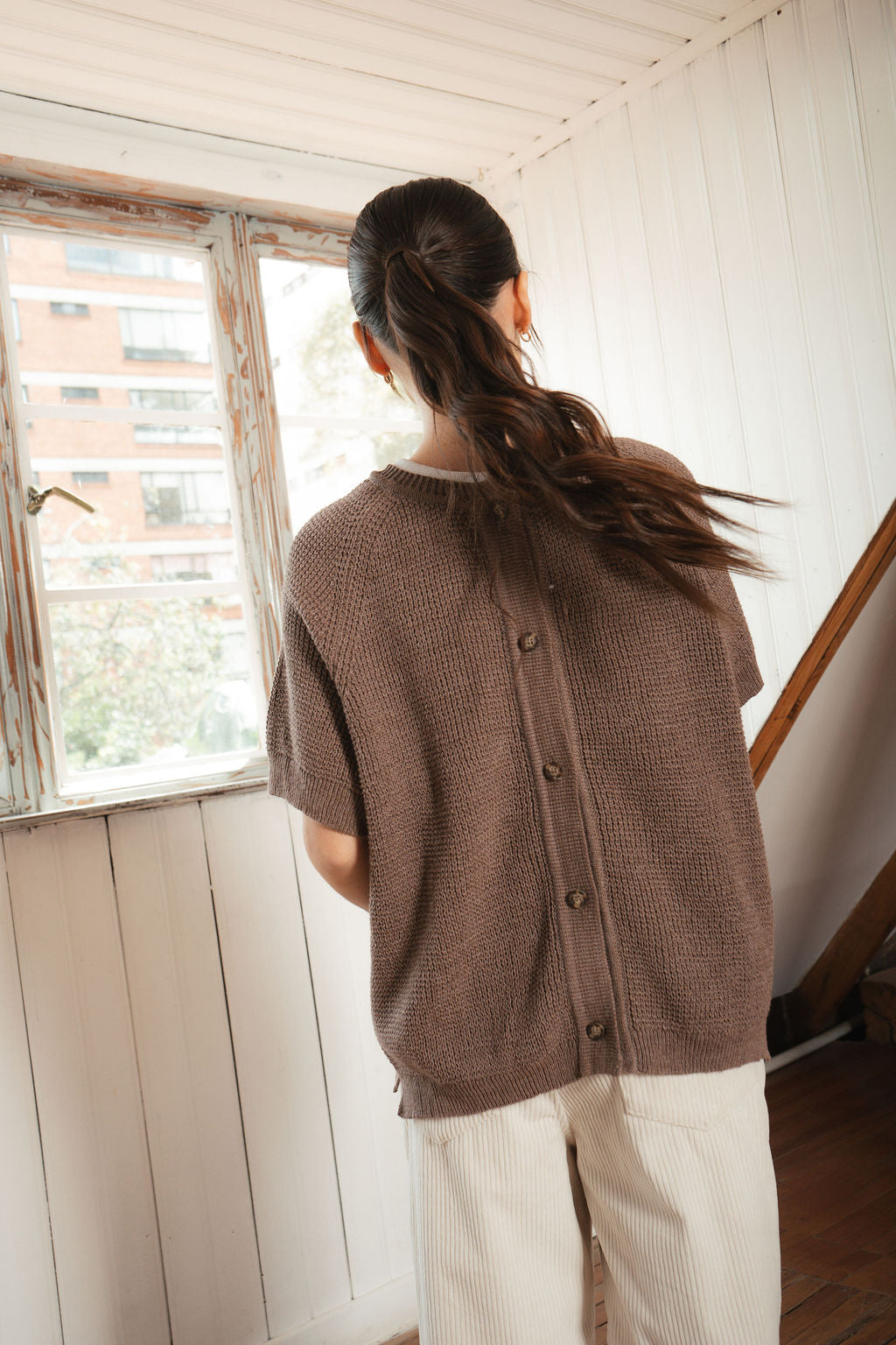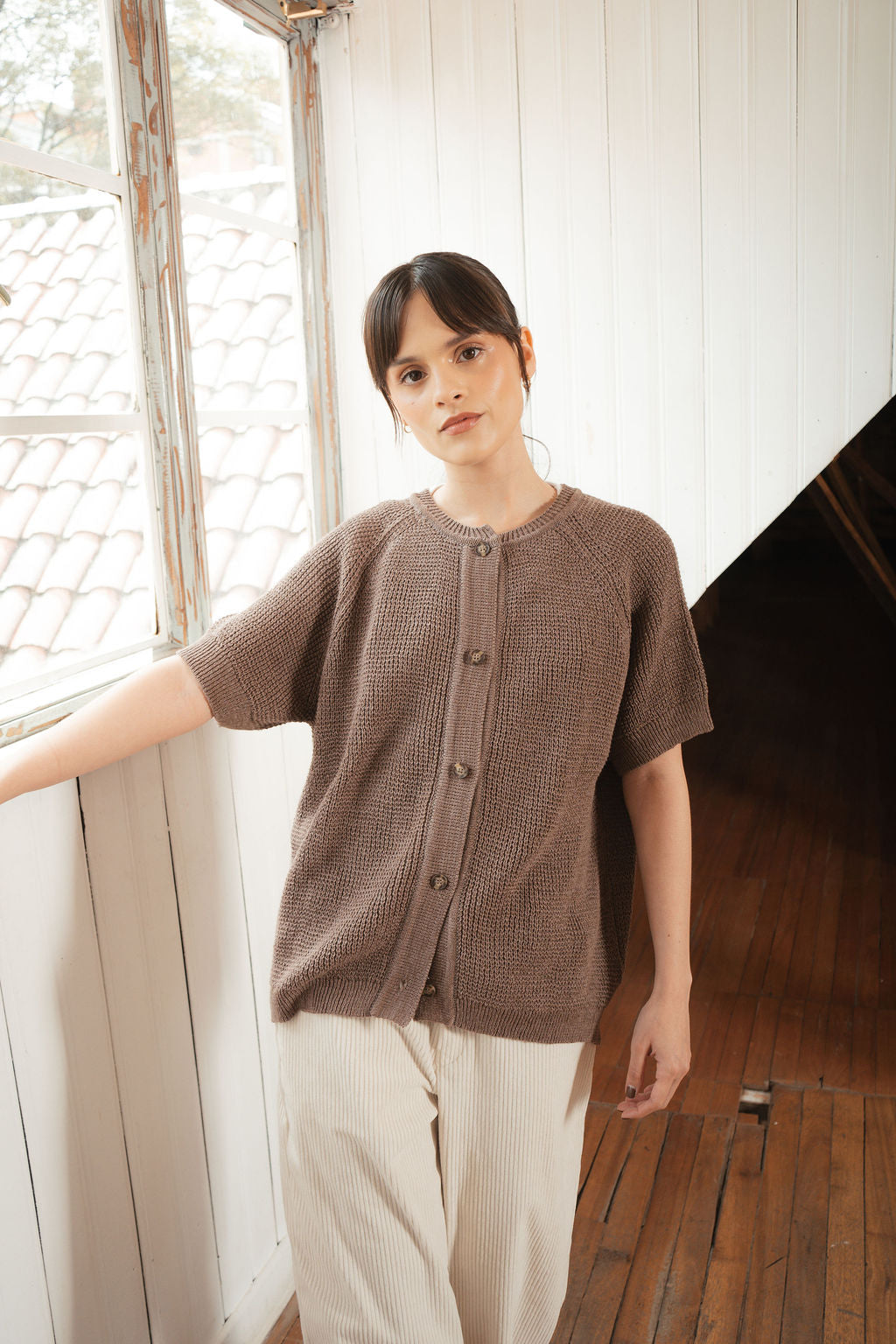 Sweater tipo cárdigan manga corta, tejido perlado. Diseño especial para usar con los botones adelante o en la espalda.
