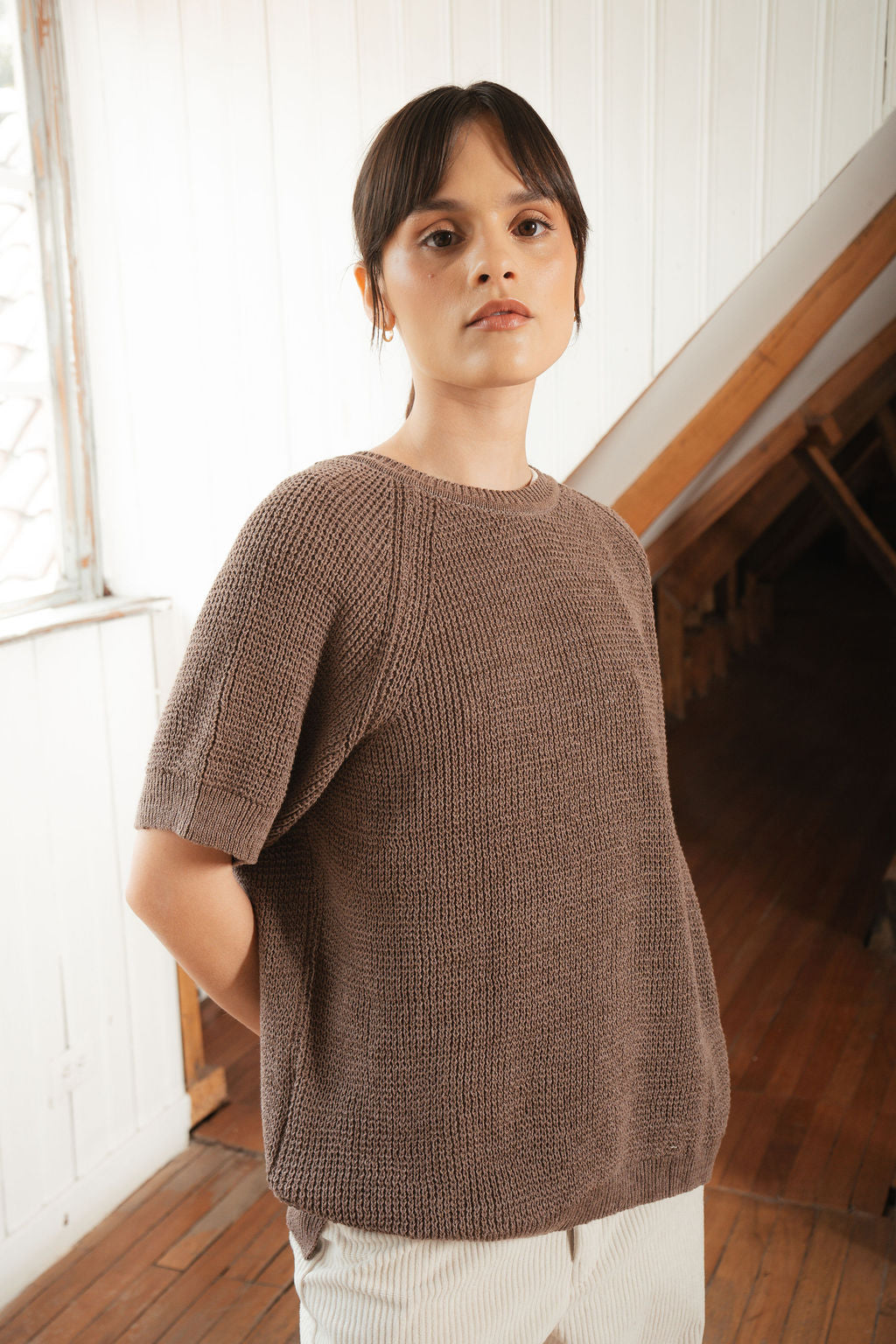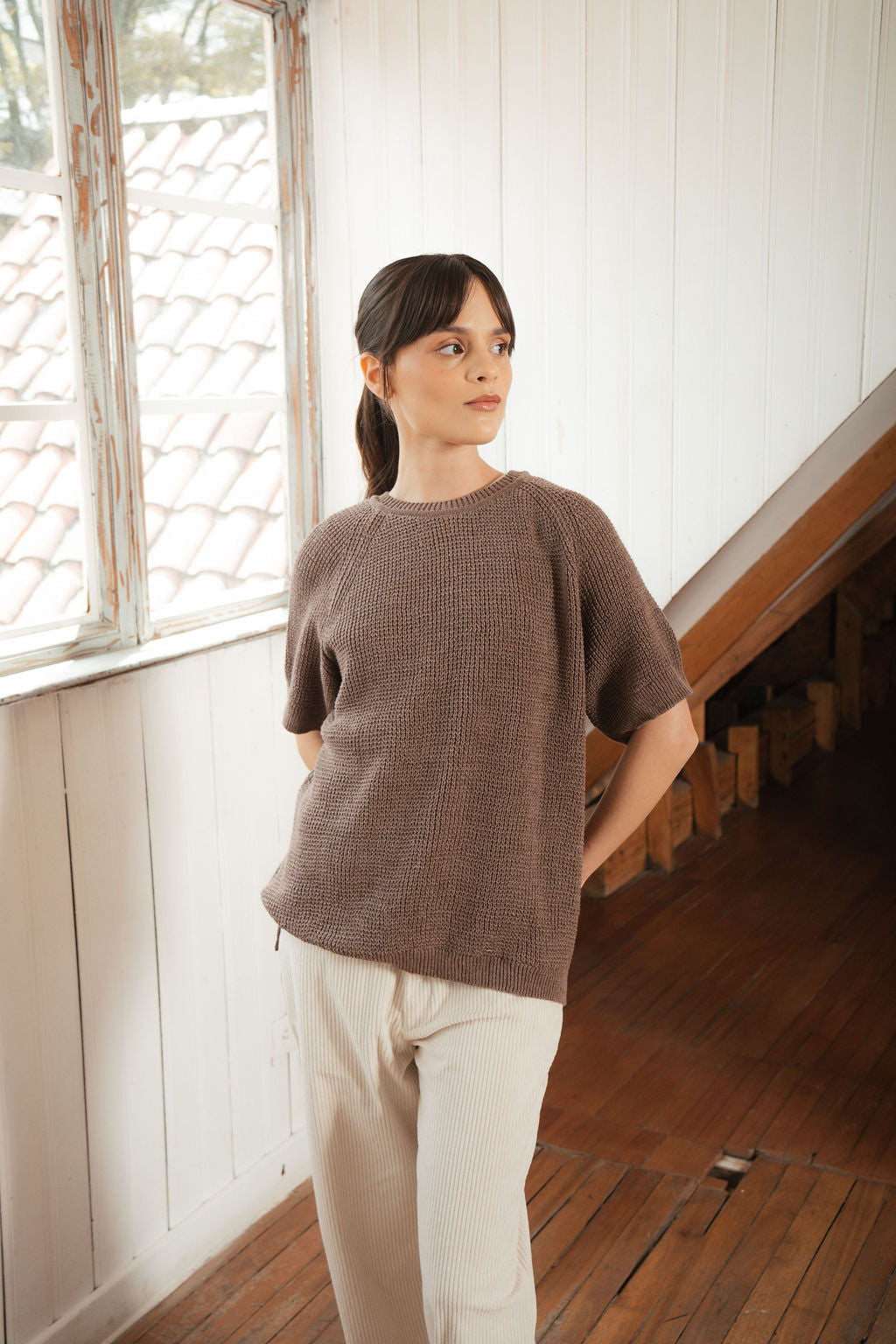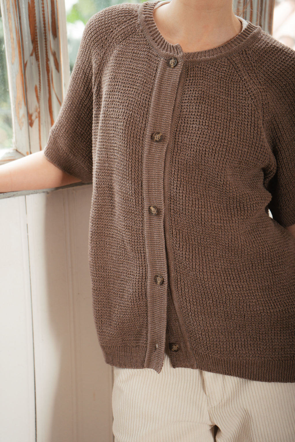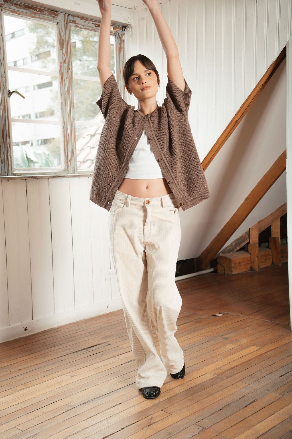 Sweater tipo cárdigan manga corta, tejido perlado. Diseño especial para usar con los botones adelante o en la espalda.