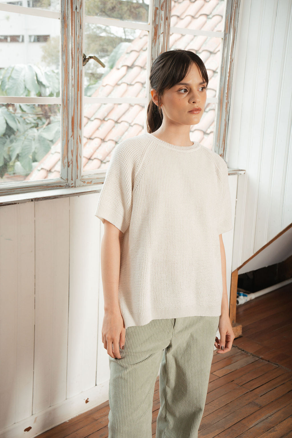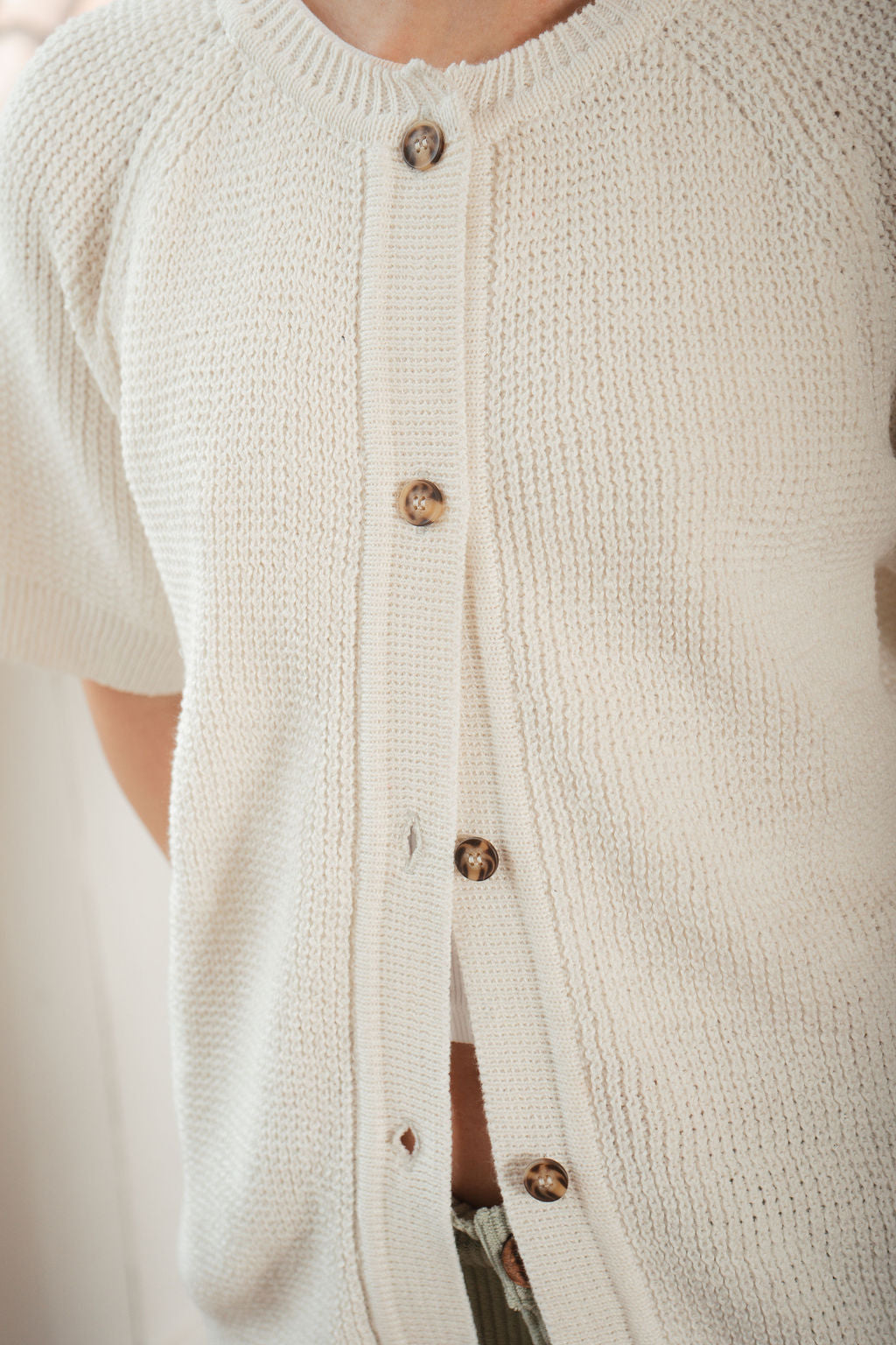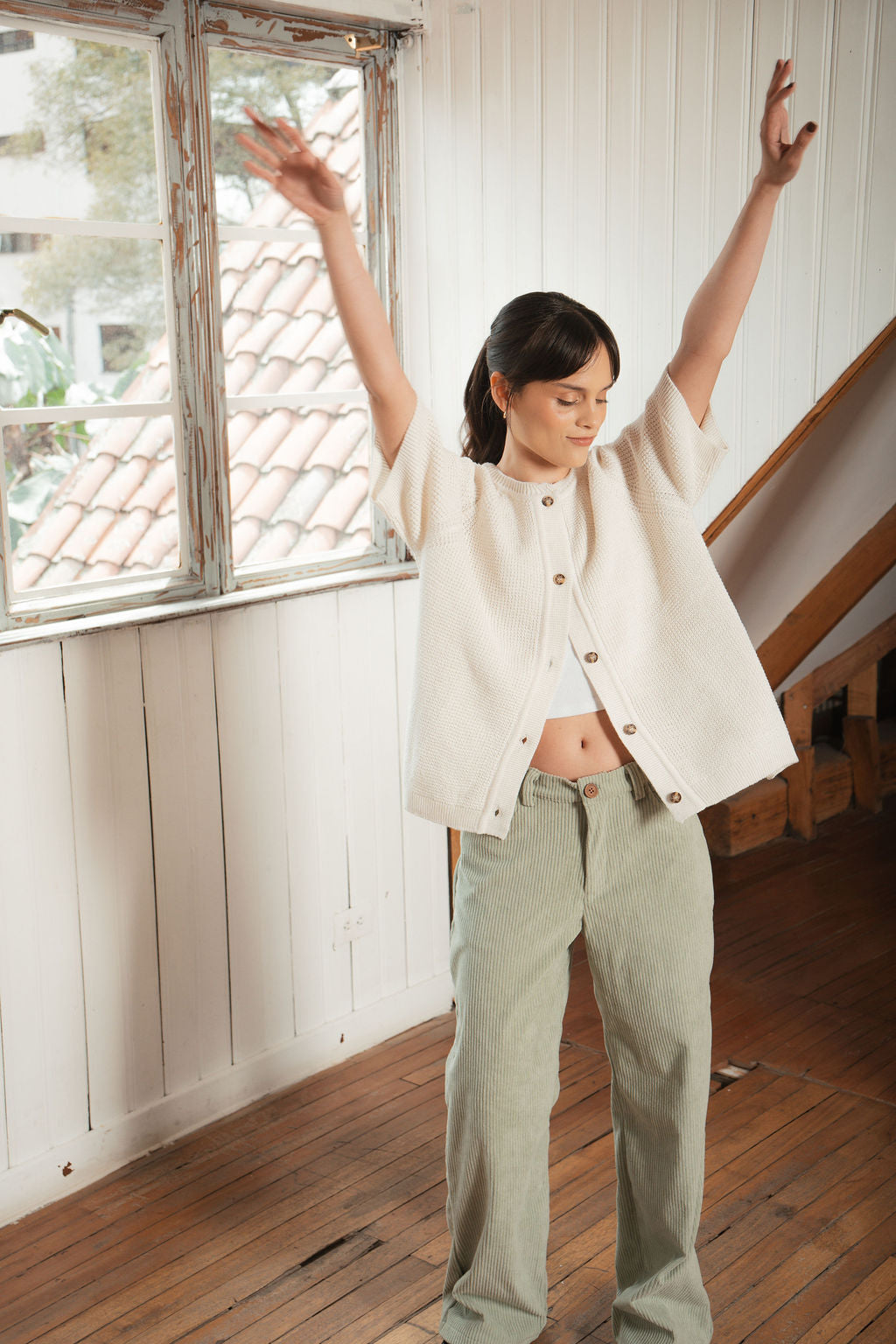 Sweater tipo cárdigan manga corta, tejido perlado. Diseño especial para usar con los botones adelante o en la espalda.