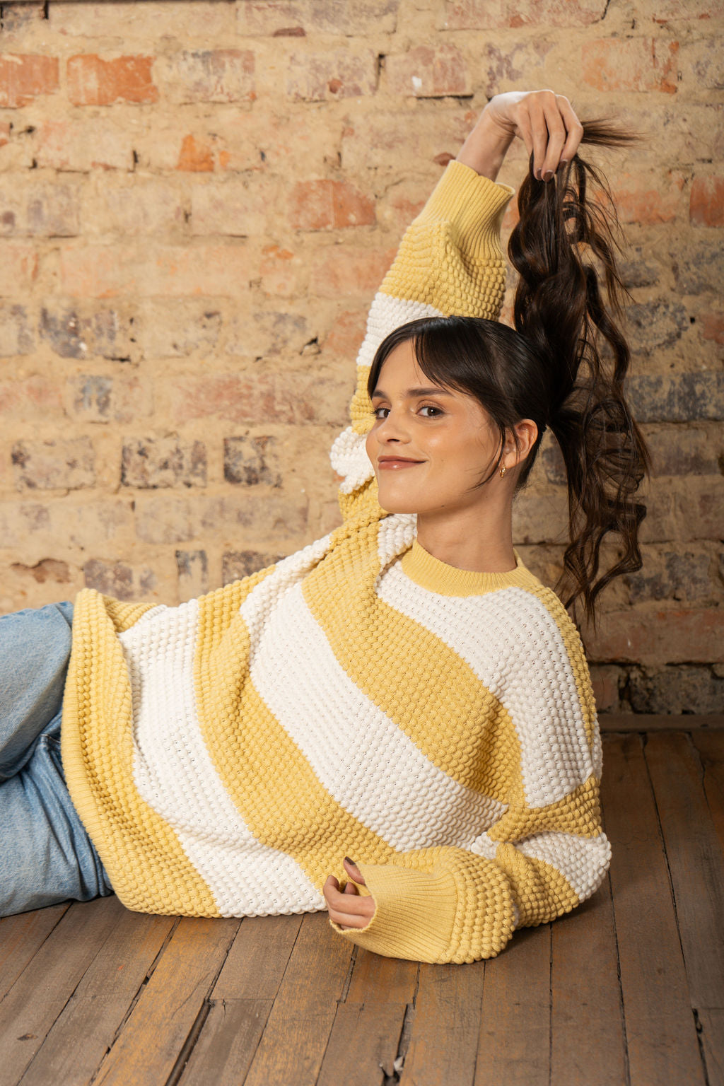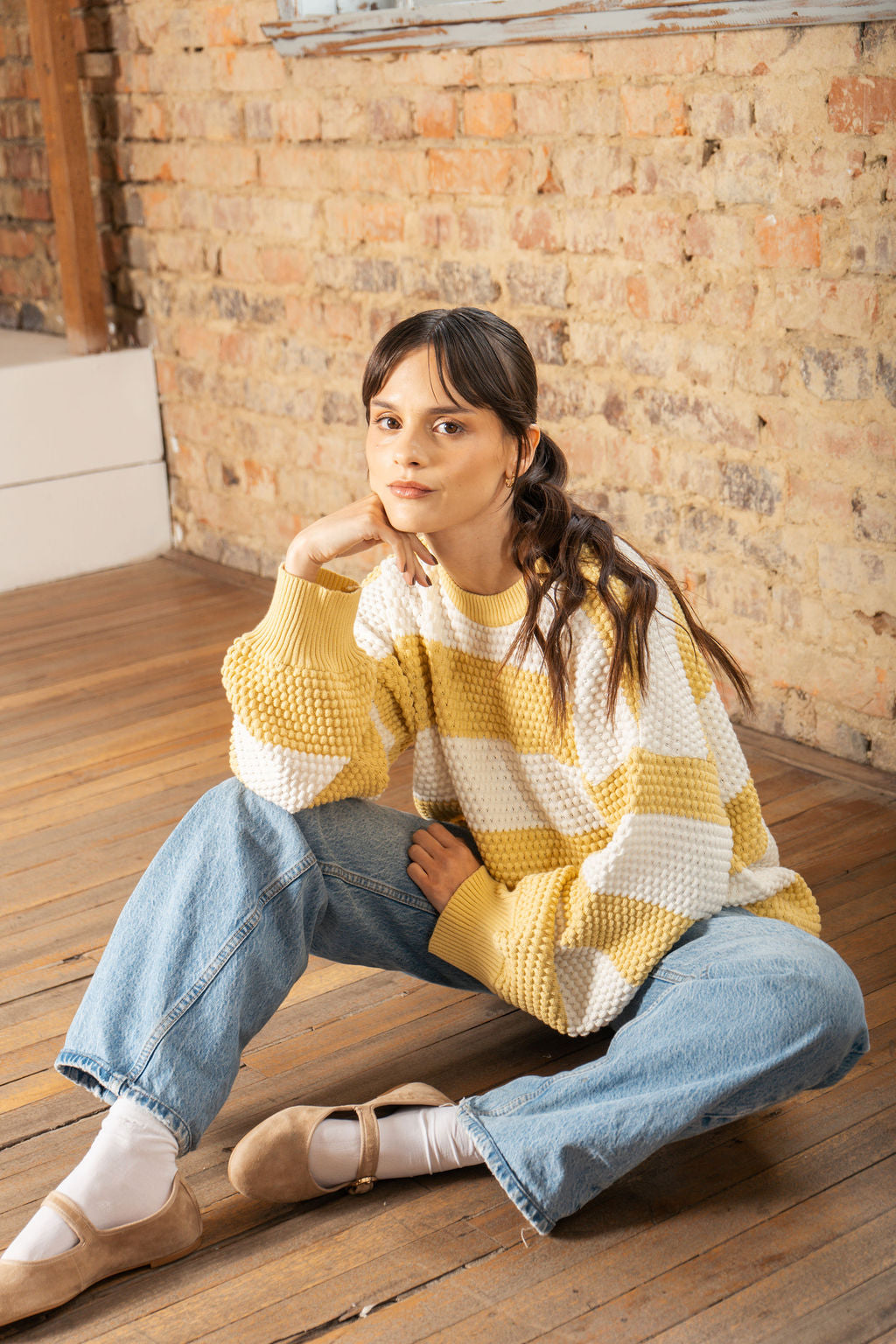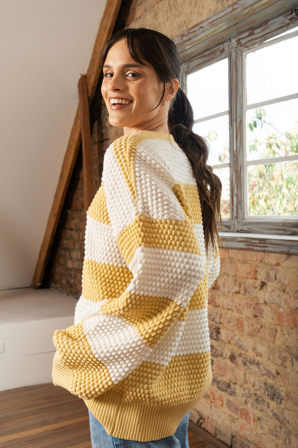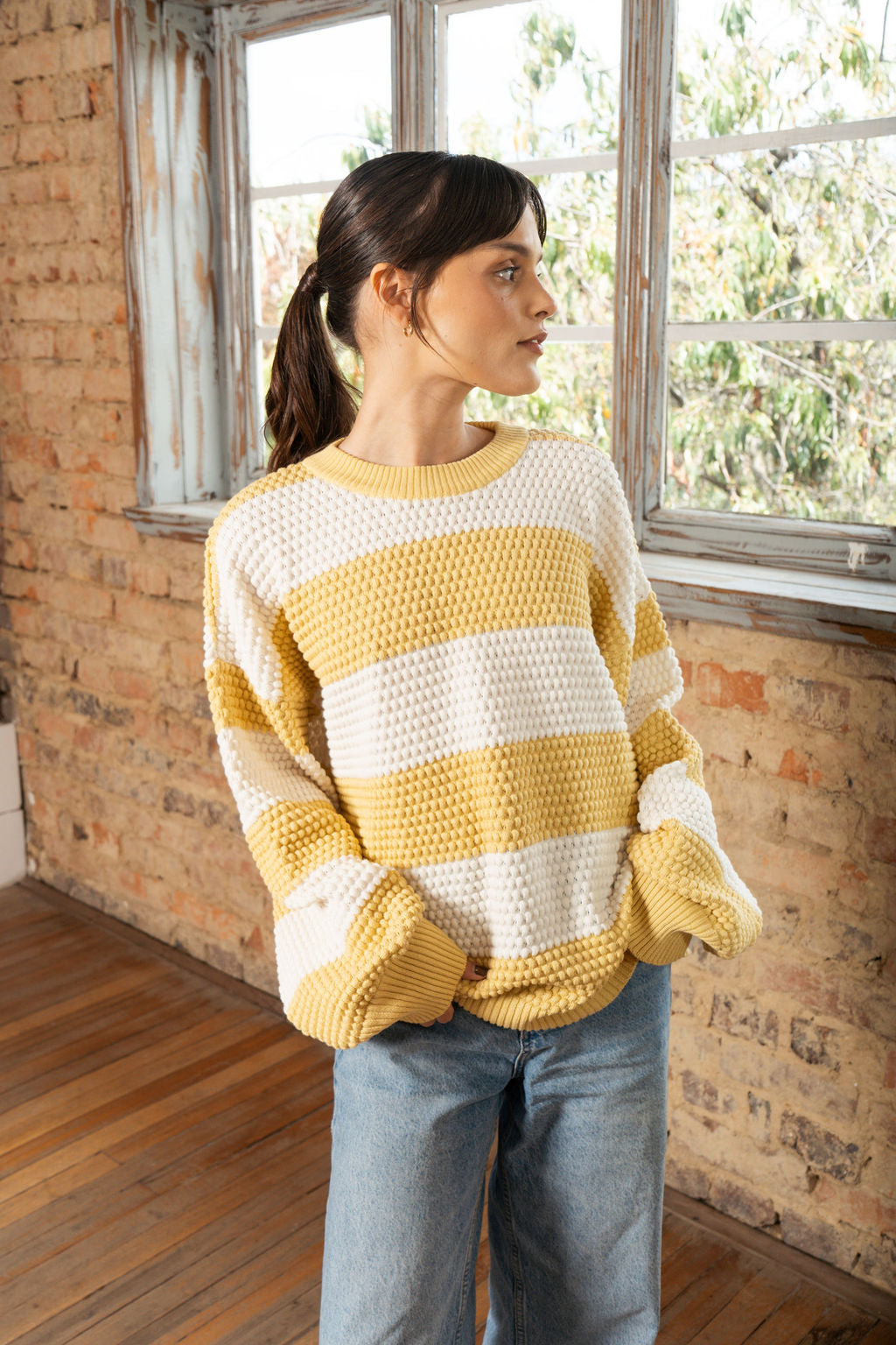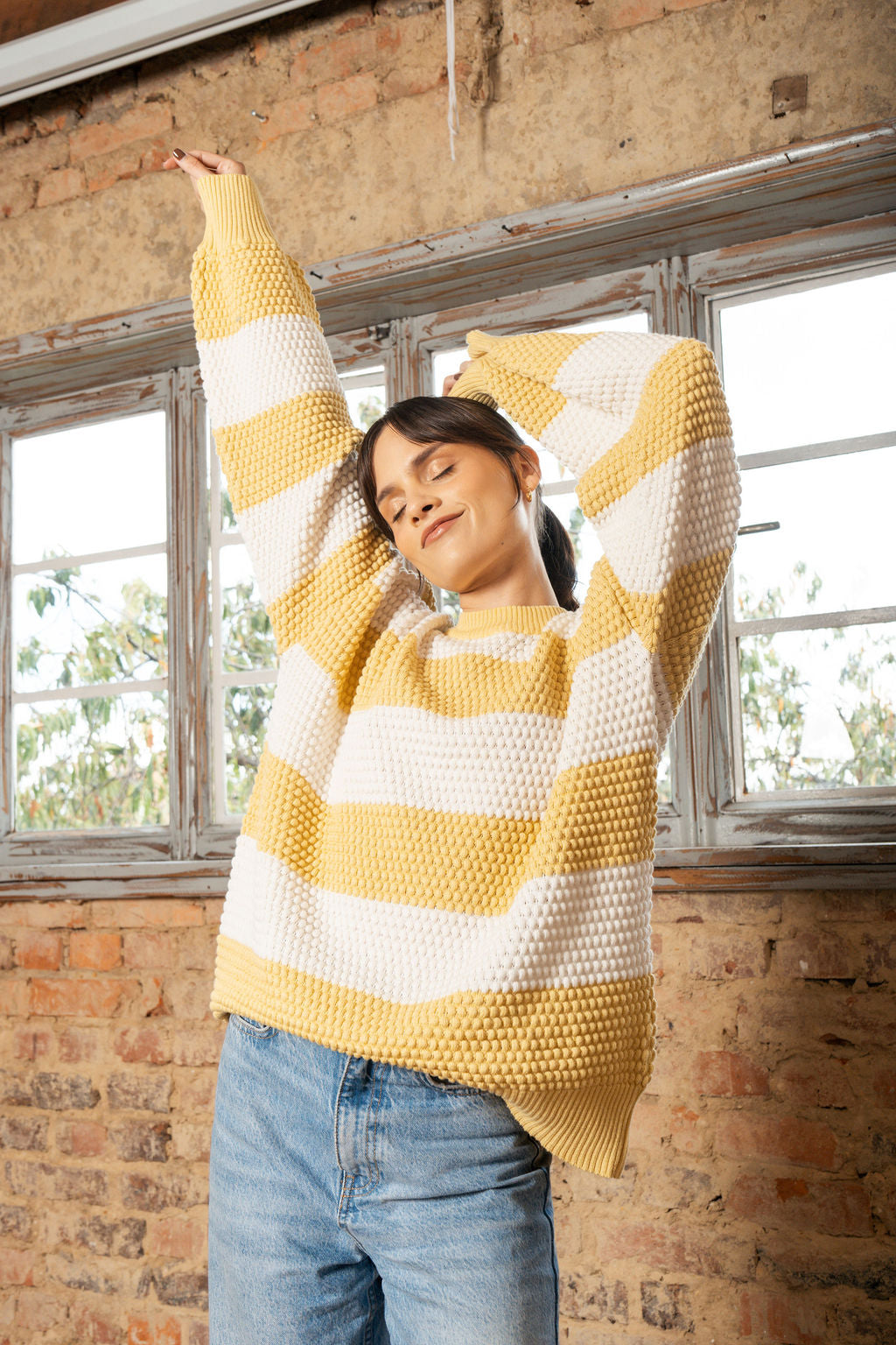 Sweater tejido en algodón con textura de bolitas. Horma sueltica y oversized.