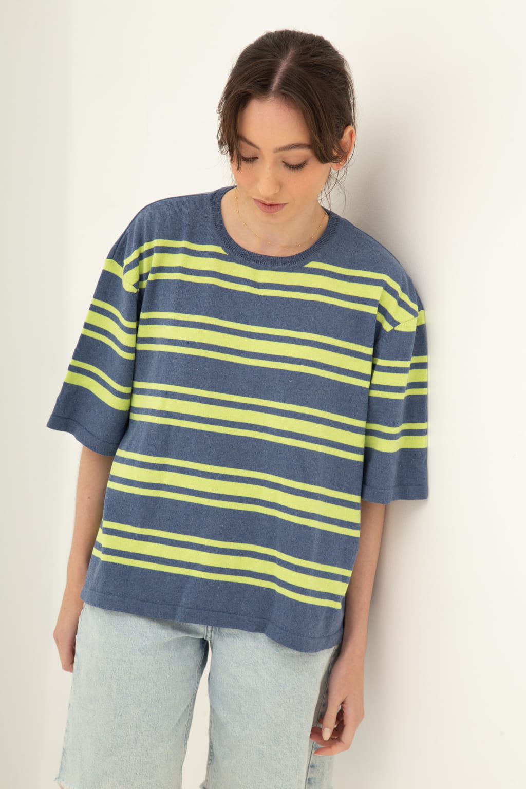 Camiseta oversized tejida en algodón regenerado, silueta relajada y cómoda.